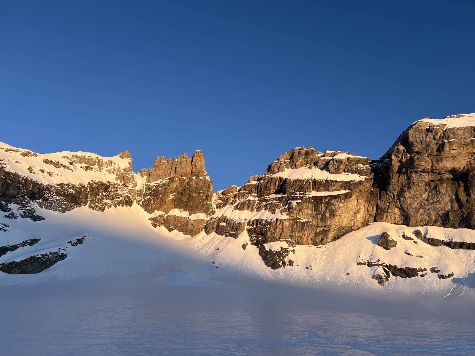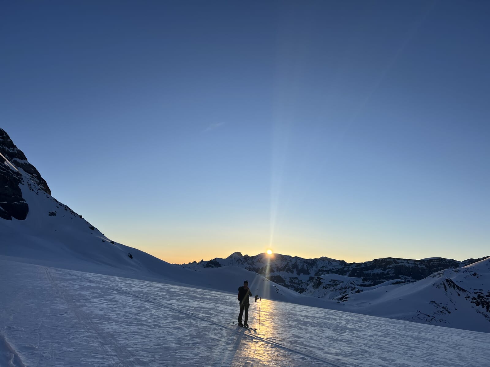 Nach einem stärkenden Frühstück wird die Stirnlampe montiert und los geht die anspruchsvolle Skihochtour auf den Tödi. Von der Fridolinshütte durchquert man in süd-südwestlicher Richtung die Moräne auf den Bifertenfirn. Der weitere Aufstieg führt über zwei anspruchsvolle Eisbrüche. Die Verhältnisse beim zweiten Eisbruch führen in der Regel zum Abschnallen der Skier. Hier kannst du deine alpinen Kenntnisse unter Beweis stellen. Je nach Bedingungen geht es in einem grossen Rechtsbogen mit den Steigeisen oder den Skiern über den Bifertenfirn bis zum Gipfel des Tödi 3614m. Die Abfahrt zu der Fridolinshütte ist traumhaft, lang und ein purer Genuss.