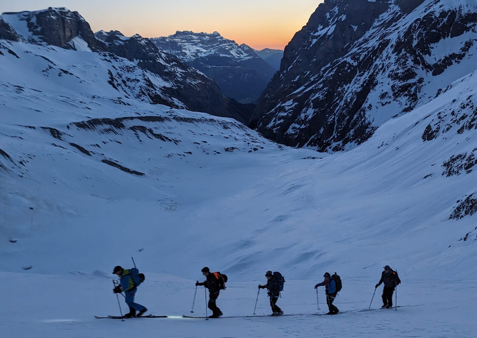 Nach dem stärkenden Frühstück wird die Stirnlampe montiert und los geht diese anspruchsvolle Skitour auf den Tödi. Von der Fridolinshütte durchquert man in südwestlicher Richtung die Moräne auf den Bifertenfirn. Der weitere Aufstieg führt über zwei anspruchsvolle Eisbrüche. Je nach Verhältnissen kann der gesamte Gletscher mit den Skiern begangen werden. Bei Ausaperung im zweiten Eisbruch müssen die Skier gegen Steigeisen getauscht werden. In einem grossen Rechtsbogen geht es nach der Spaltenzone über den Bifertenfirn, der sich wie ein glänzender Teppich vor uns ausbreitet. Wer die "Klagemauer" überwunden hat, kann sich spätestens jetzt über den nahen Gipfel freuen! Das schöne Gipfelkreuz und die fantastische Weitsicht entschädigen für alle Anstrengungen. Die wilde und lange Abfahrt von über 2`800 Höhenmetern führt der Aufstiegsroute entlang und kann die Oberschenkel nochmals ganz schön fordern. Der Tödi, die Königstour schlechthin!