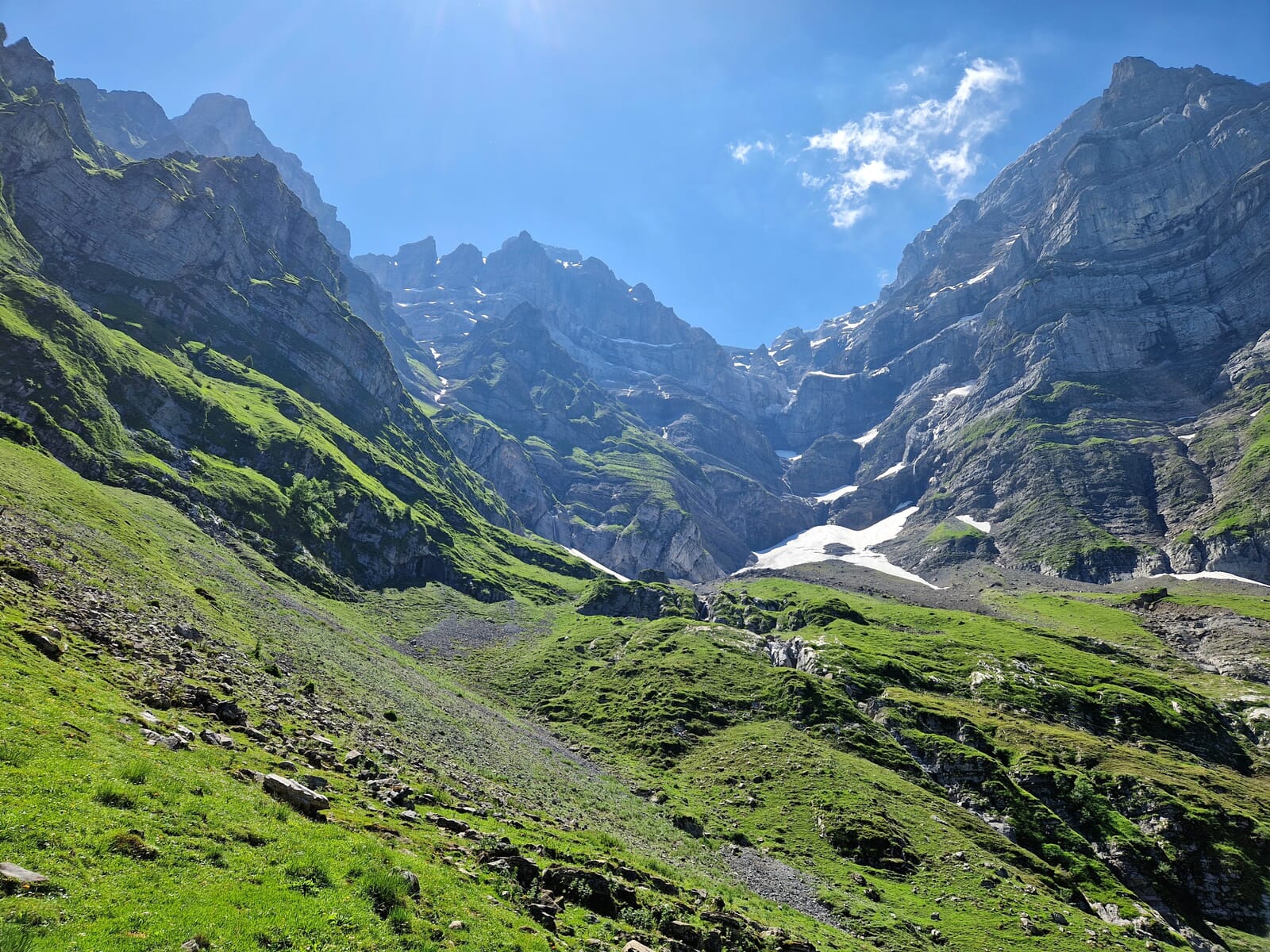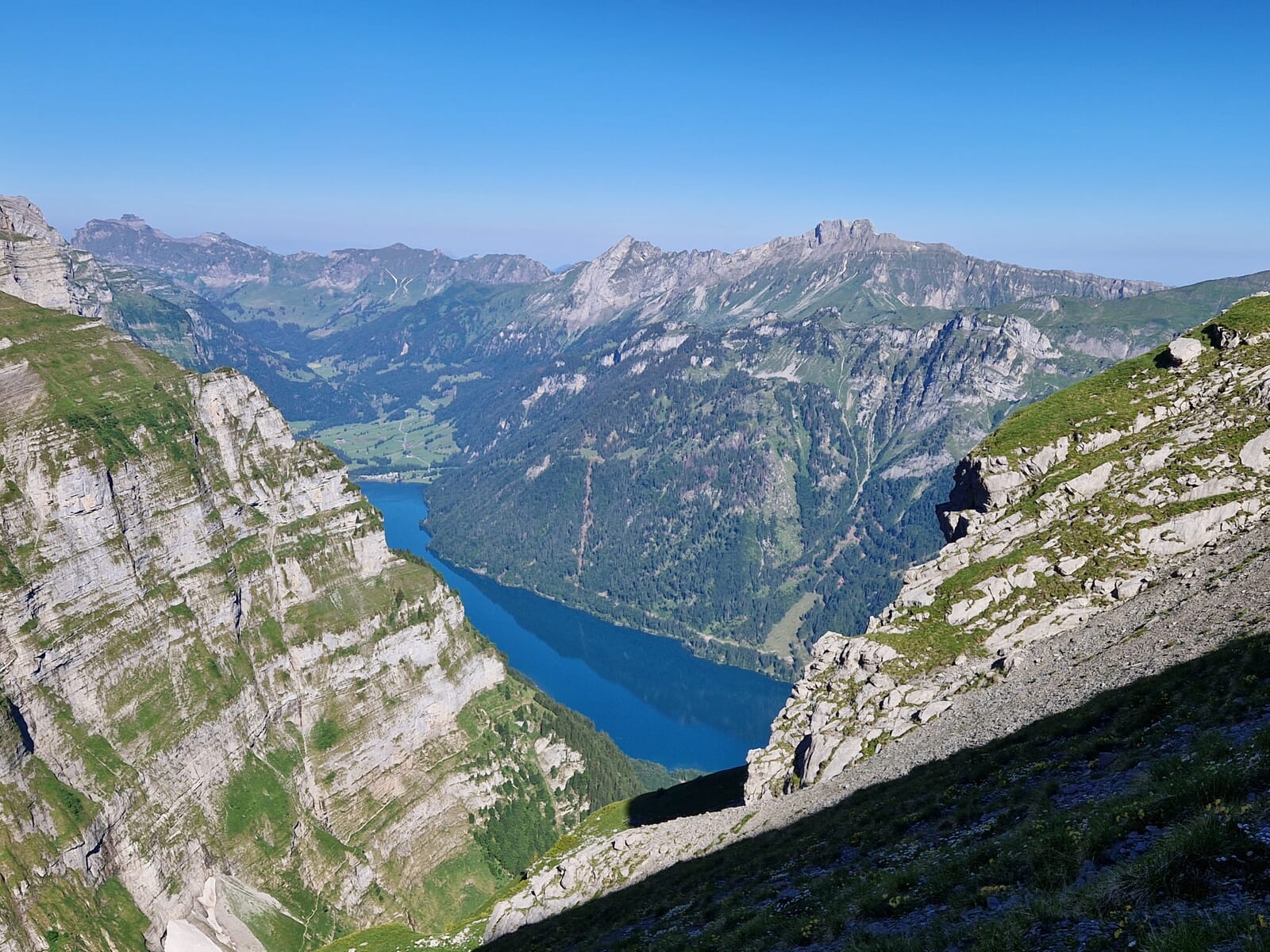 Nach einer erholsamen Nacht und einem guten Frühstück macht ihr euch auf zu eurem Expositionstraining. Der blau-weisse Bergweg führt steil hinauf und verläuft erst meist im Schatten. Kurz nach der Drachenhöhle erreicht ihr die erste Schlüsselstelle, ein mit Ketten gesichertes Felswändlein. Nachdem ihr die Schafalp Gleiter (1472m) erreicht habt, führt der Pfad an den Fuß einer senkrechten Felswand, unter welcher ihr auf einem mit Stahlseilgeländer versehenen Felsband in nördlicher Richtung quert. Durch einen ebenfalls mit Ketten gesicherten Kamin erreicht ihr die Glärnischplanggen. Nun führt der Weg unschwierig, aber auf schuttigem Gestein bis zum Gipfel des Vorder Glärnisch.