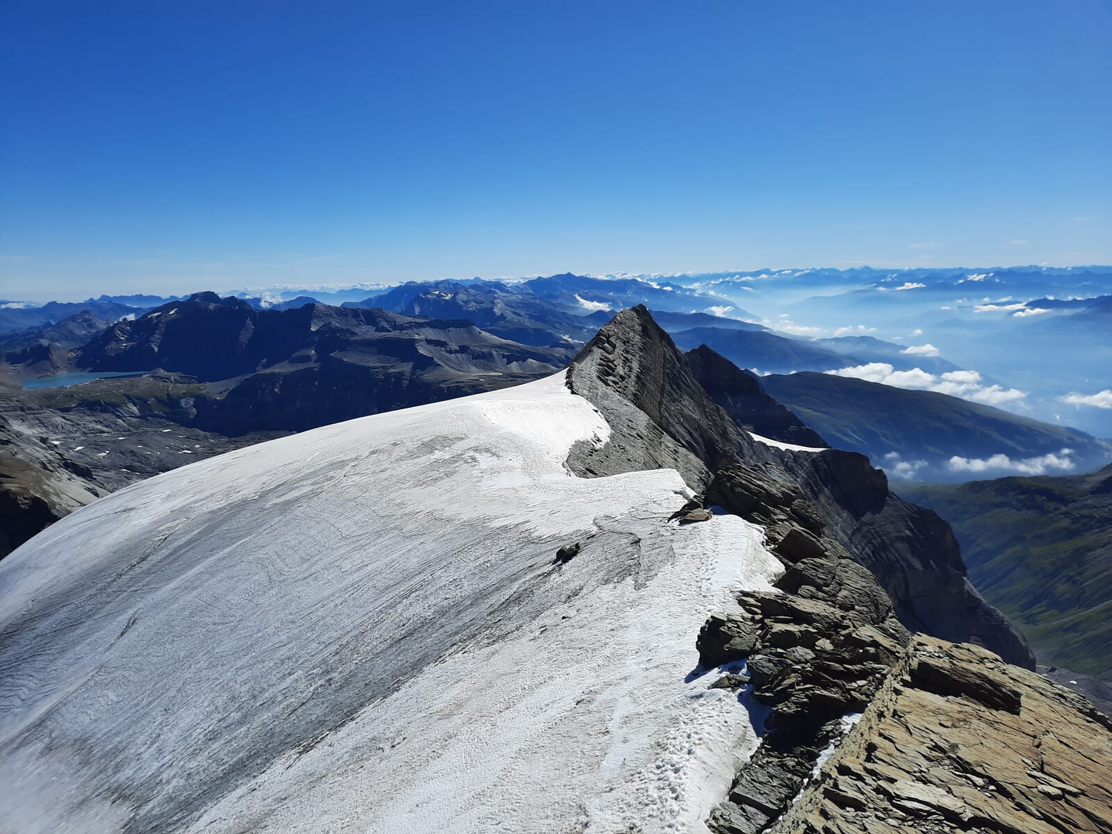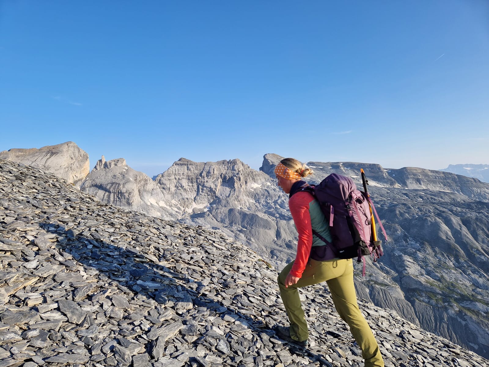 Der Bänderweg auf den Bifertenstock sucht seinesgleichen. Steht man am Beginn des Bandes am ersten Kessel, so benötigt man einen Moment, bis man die Dimensionen erfassen kann. Einmal unterwegs auf dem exponierten und stellenweise sehr luftigen Bänderweg fällt der Blick über abschüssige Kalkplatten direkt ins wilde Val Frisal und verschlägt einem fast den Atem. Die letzten Meter über ein steiles Schneefeld und eine mit einer Kette und Stiften gesicherten Platte führt auf den Ostgrat. Auf dem Gipfel werden wir mit einer grandiosen Aussicht zum Tödi, dem Selbsanft und in der Ferne allen namhaften Gipfeln des Alpenbogens belohnt.